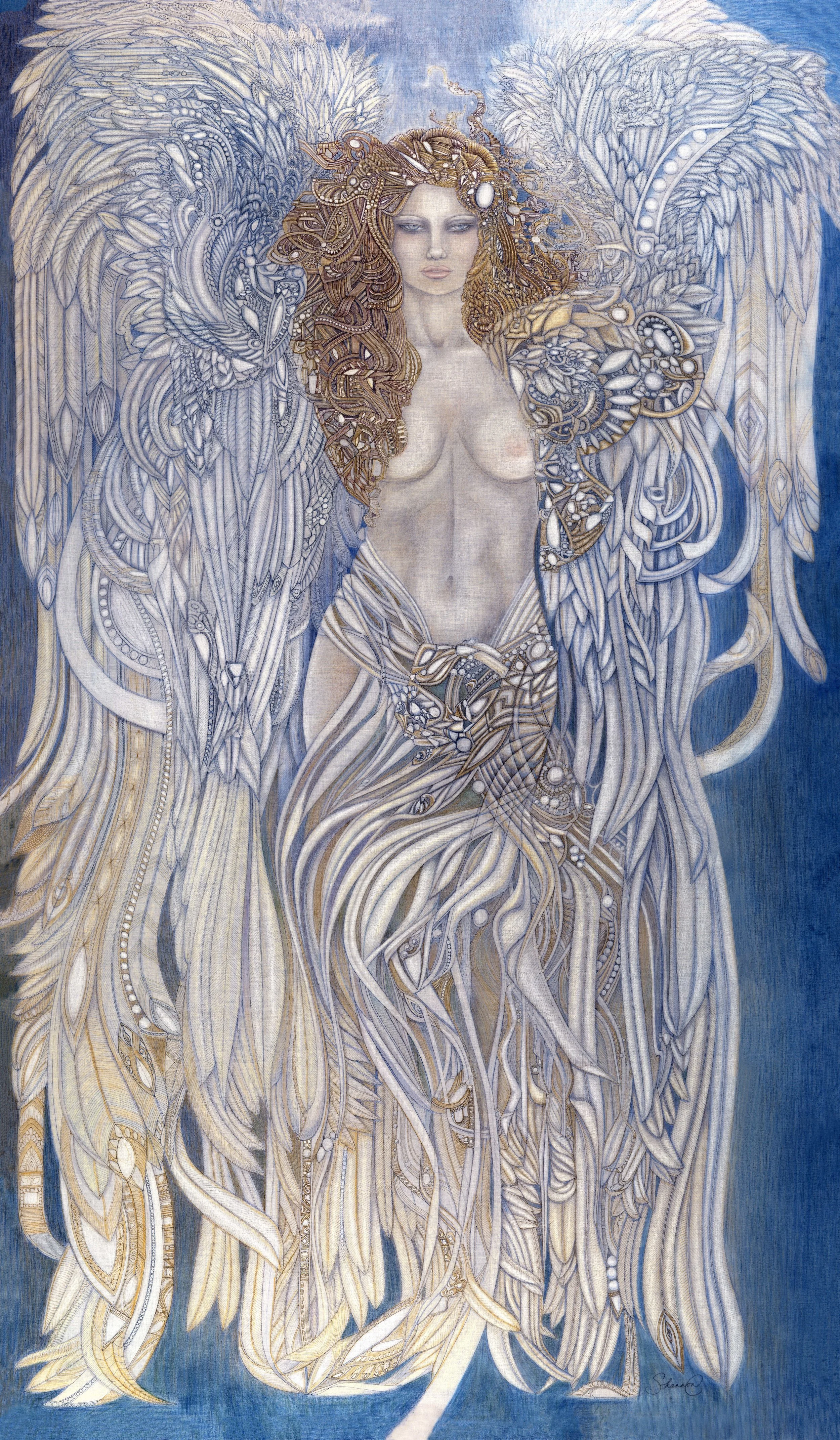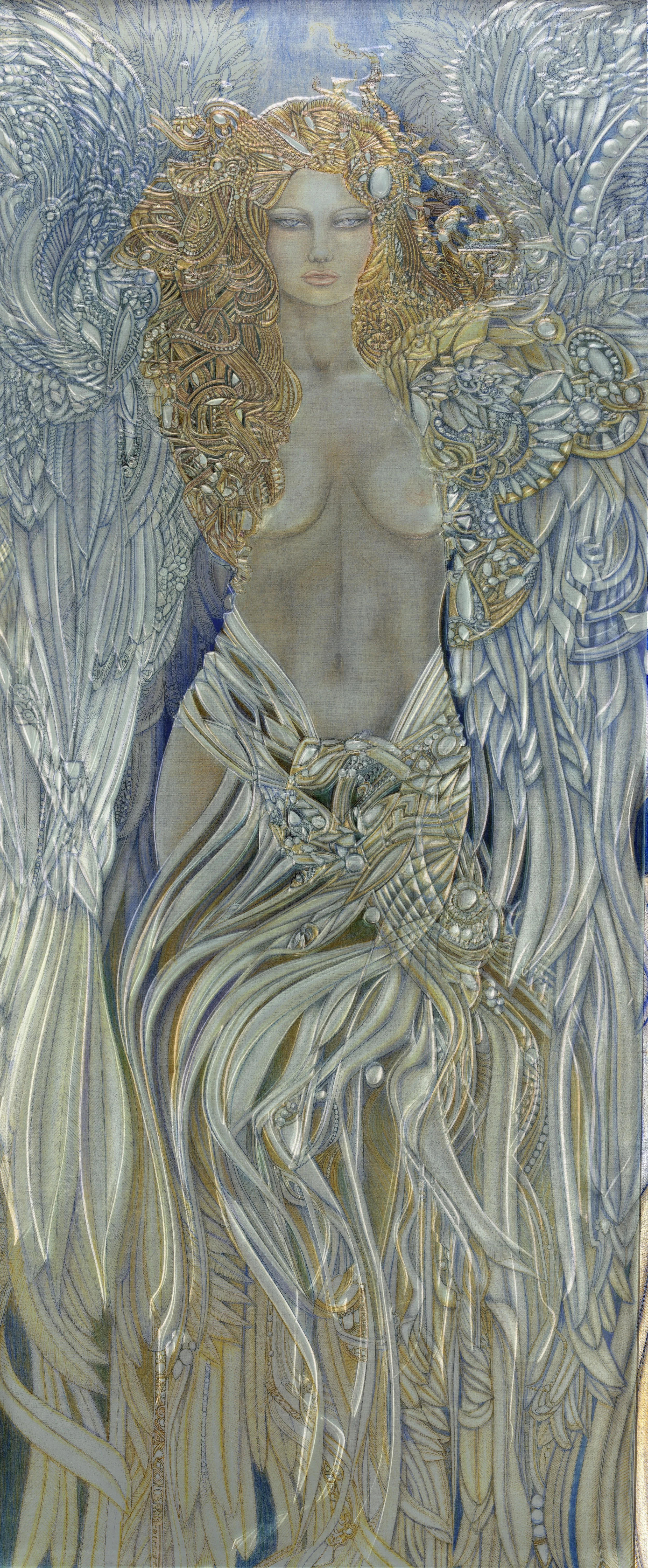 An angel descends from a heavenly blue sky with jewels in her hair, driving out all forces of evil and doubt before her. The first in the artist’s Angels series, this image was created by taking a rubbing, or hand print, on canvas of an original carved glass creation, and then expanding on it to create a completely original and majestic image.