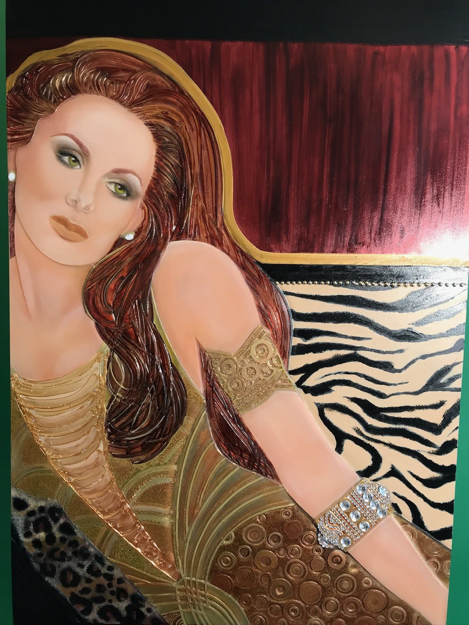 "Genesis" - Portrait of Joanne. Carved Glass, Poured Resins, Gold Leaf, 28" x 68"