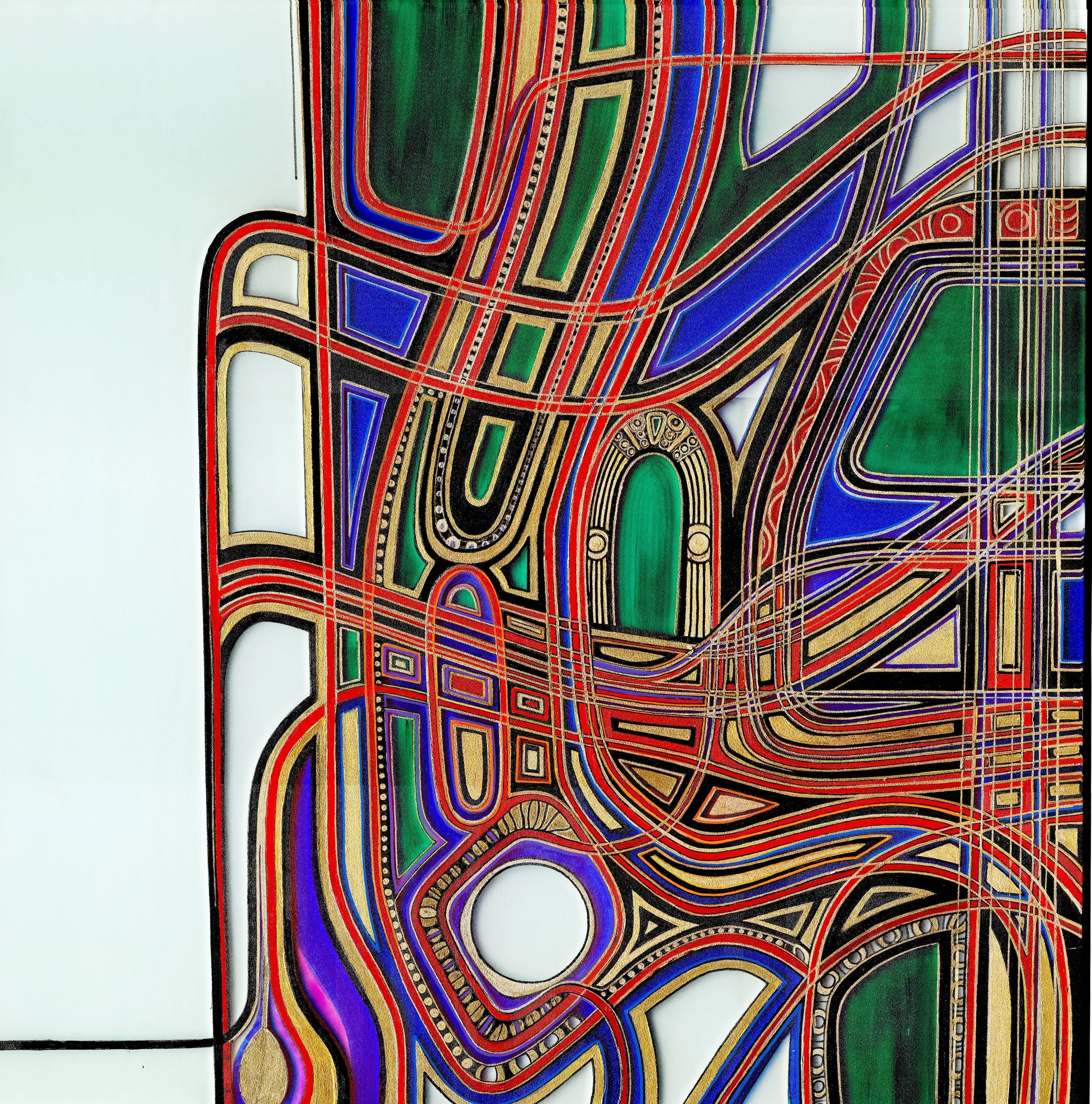 The Kaleidoscope transports the viewer to a far away, mythical city. This is the first creation in the artist’s most recent exploration of abstract yet precise shapes and forms that come to life on the surface of the glass panel. The Kaleidoscope is notable for it’s use of open space, showcasing both the look and texture of the frosted glass panel, while also creating unique depths of perspective.