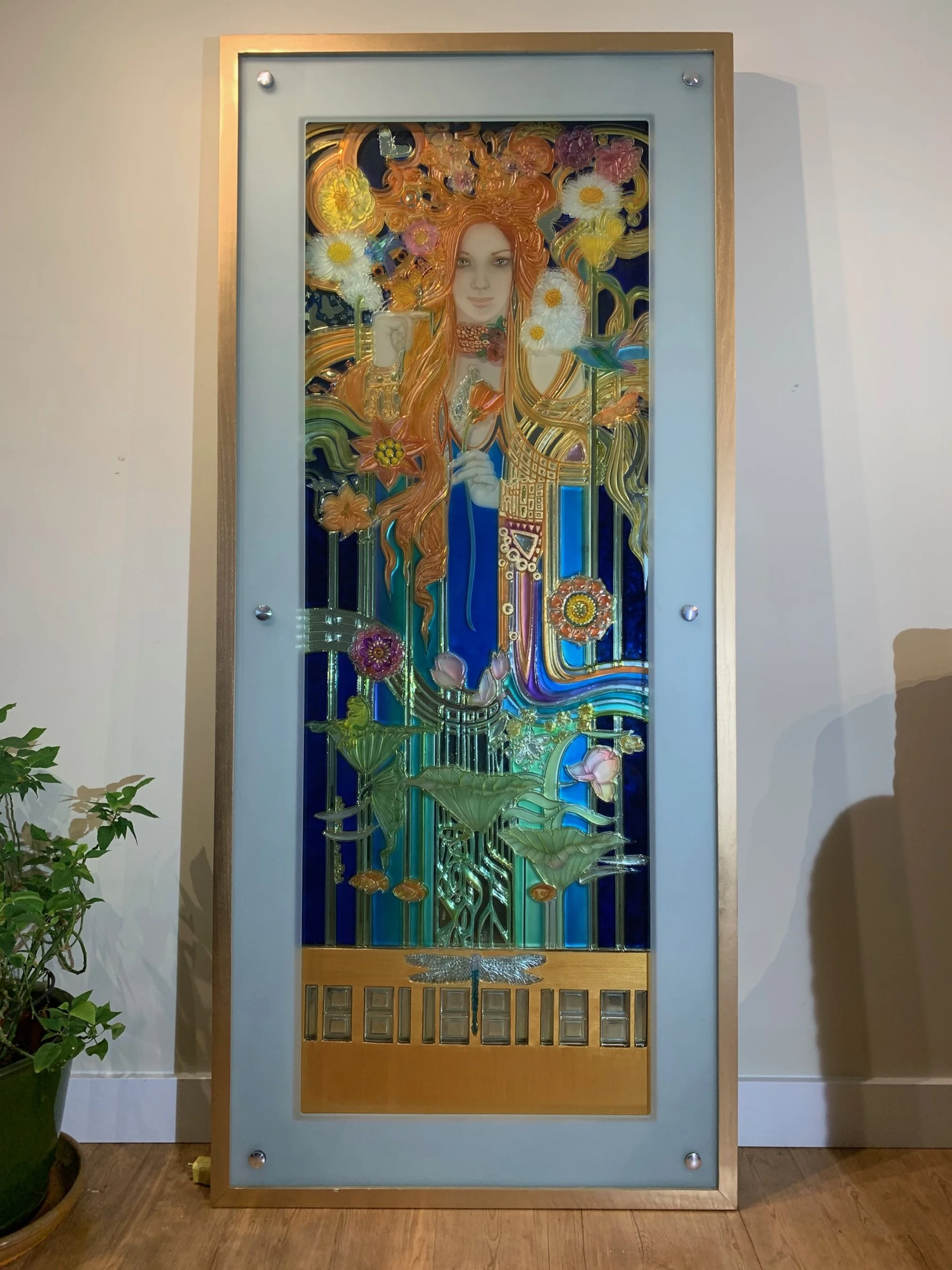 "Genesis" - Portrait of Joanne. Carved Glass, Poured Resins, Gold Leaf, 28" x 68"