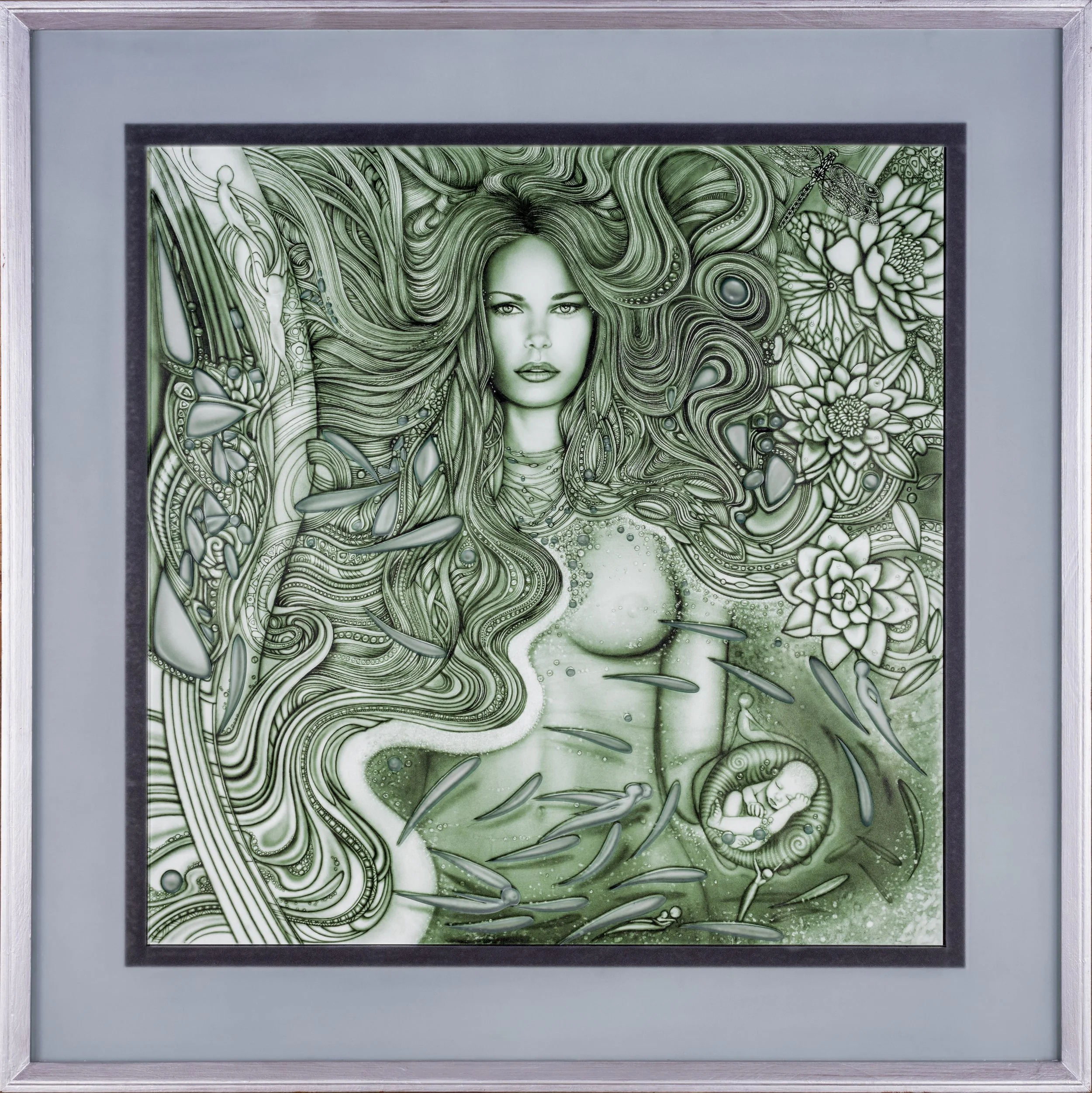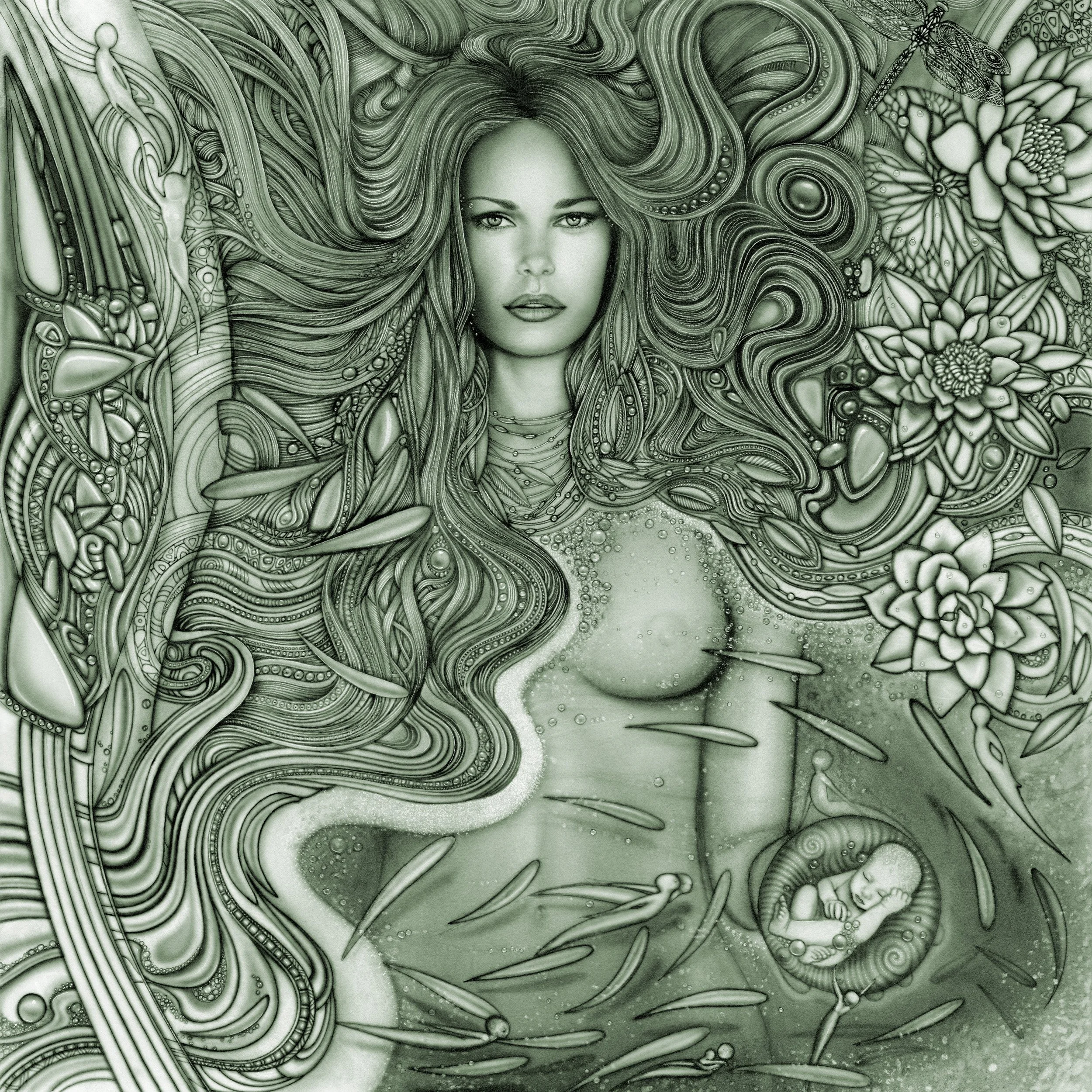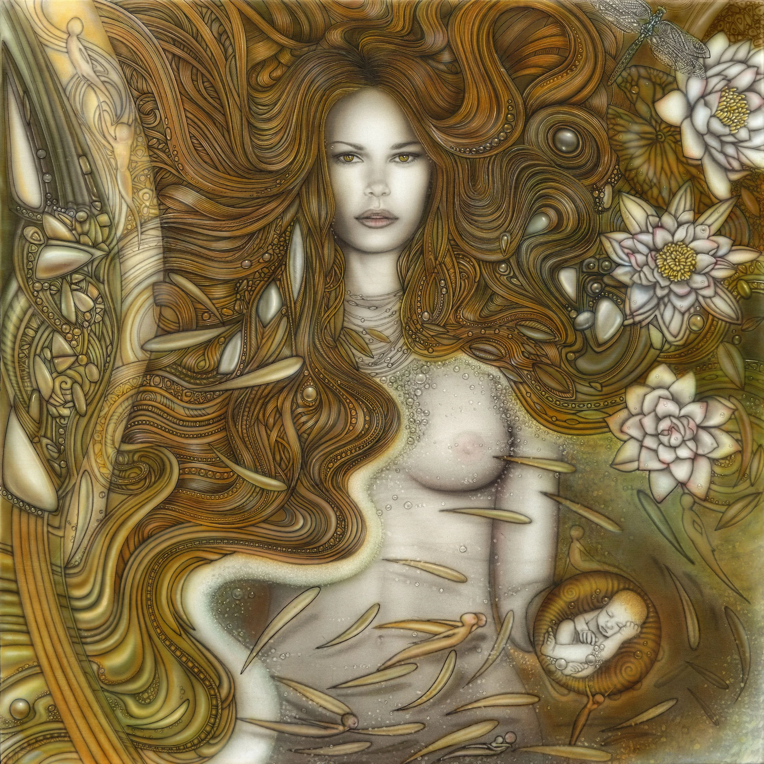 Rhiannon gazes at the viewer from the calm depths of a gentle river that flows through a special corner of heaven, caring for the spirit of an unborn infant as sprites move between worlds attending to the sleeping baby in its woven basket.