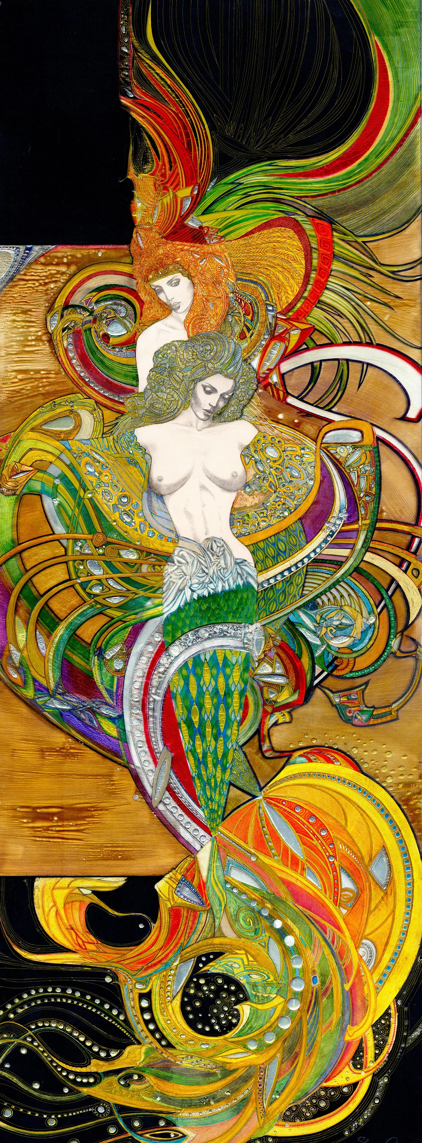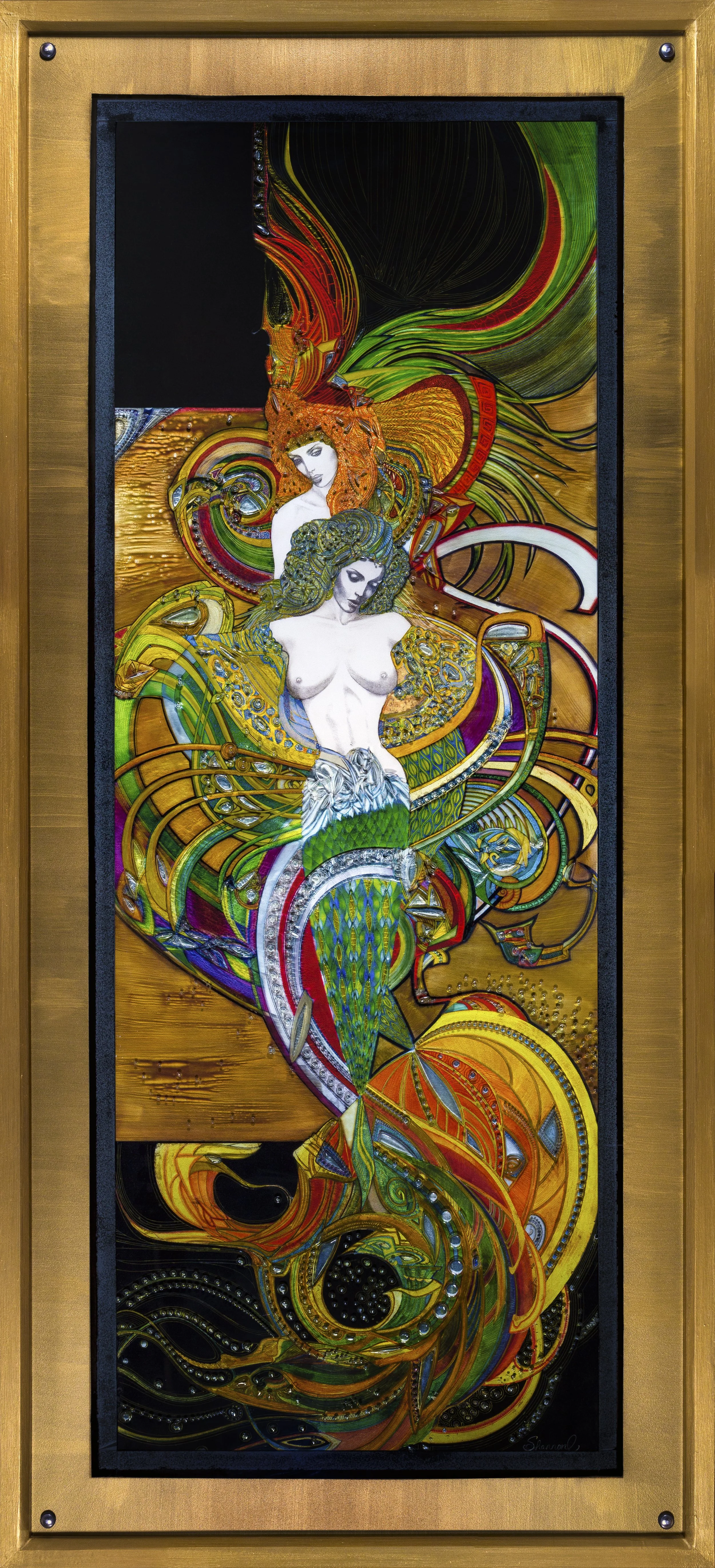 You are a diver in the deepest ocean. You enter a cave, and turn on your spotlight, and in that sudden flash you catch a glimpse of the supernatural. Two mermaids, sisters, surrounded by a swirl of color. No one will believe you when you tell them what you’ve seen, but the memory will stay with you forever. Part of the artist’s Mermaids series, Sisters is created with paints, gold leaf, and mixed media on an un-carved glass panel.