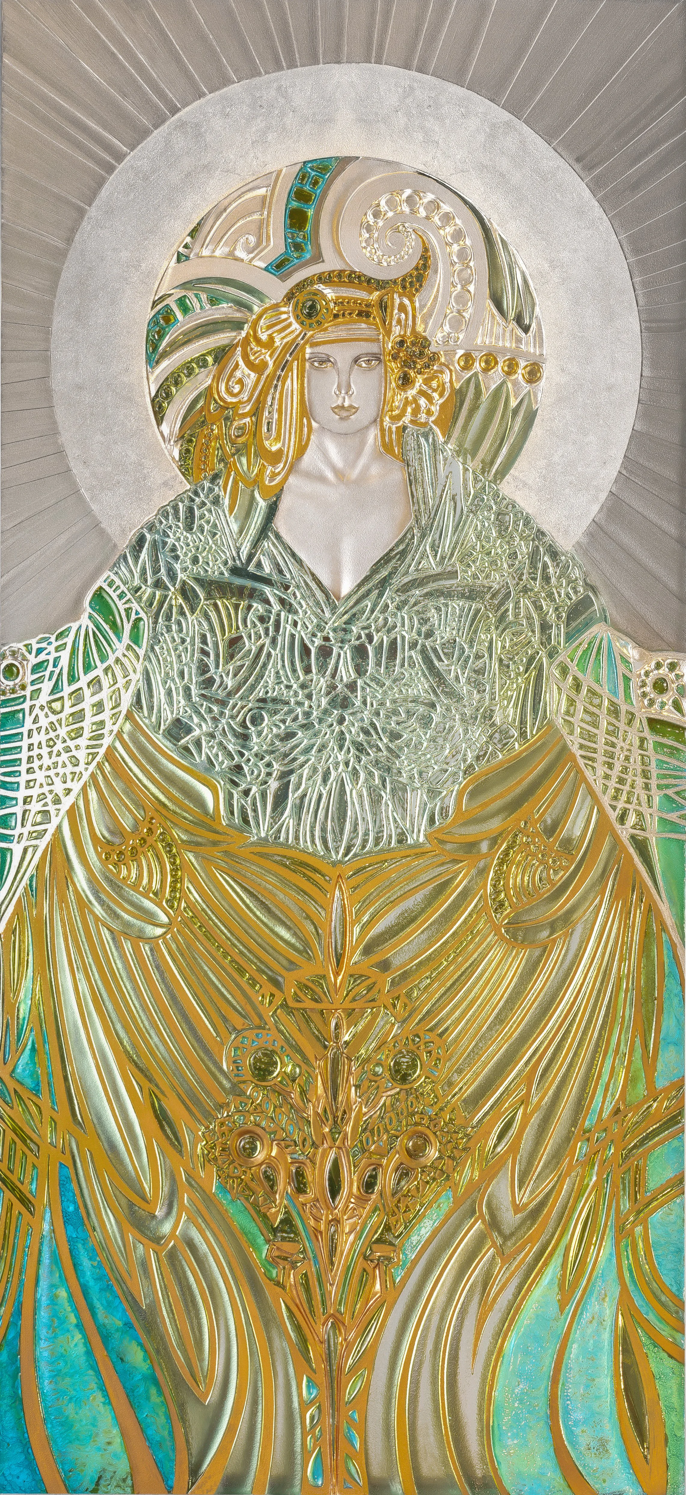 Inspired by the mysterious energy of the Winter Solstice, Sister Moon floats above as we bathe in the glow of her flowing raiment. Carved into a 3/4” thick piece of beveled glass, the artist then added poured resins, Silver Leaf and Gold Leaf. Like many of her works, the three dimensional carved glass combined with the other translucent materials makes the work move and shimmer and change with the light of the room when viewed in person.
