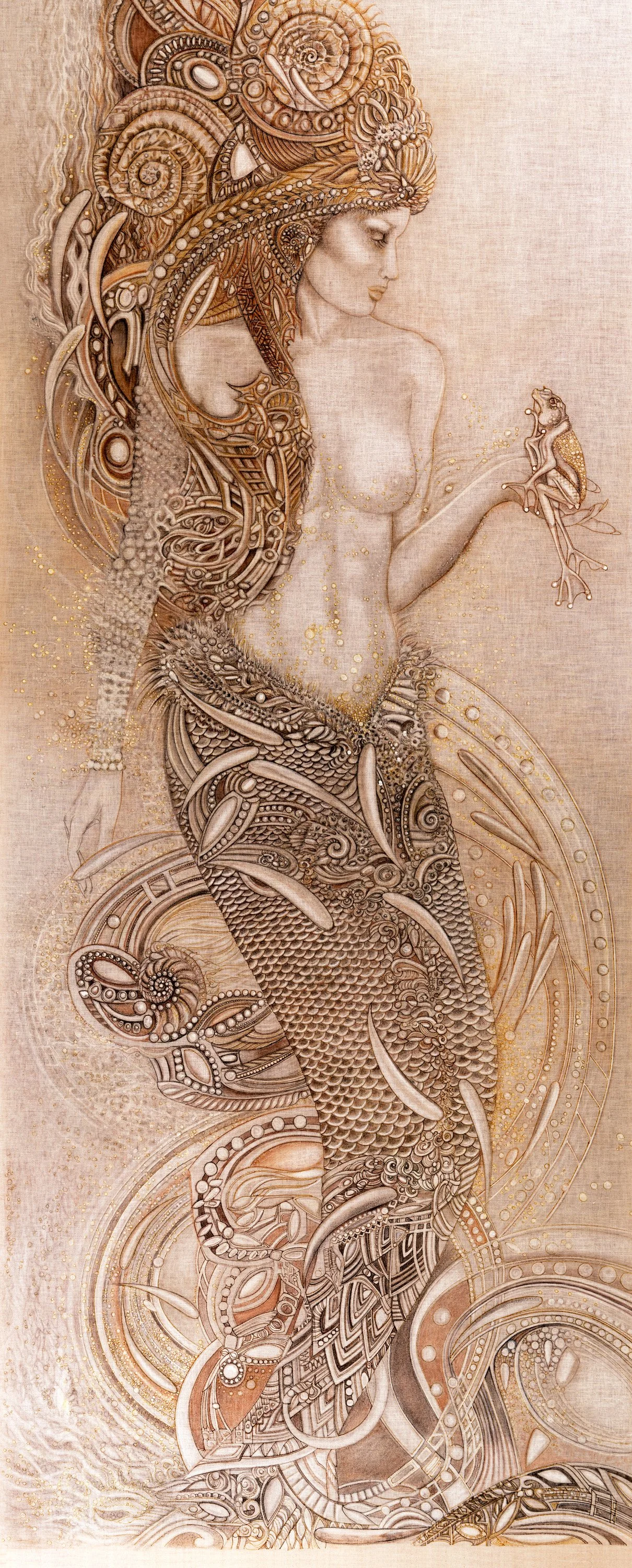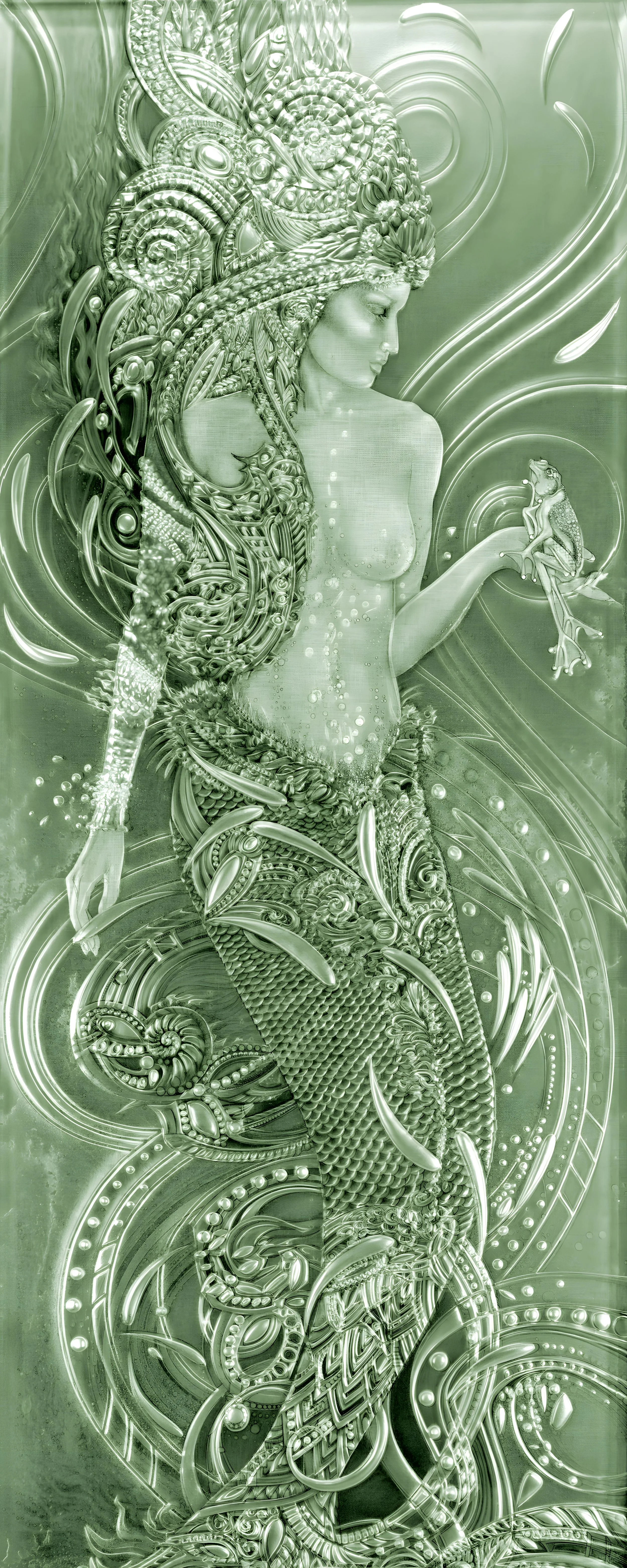 A warrior princess Mermaid from the islands off the coast of Spain, she contemplates a frog who clearly adores her. An untold fairy tale, perhaps? Carved into a 3/4” thick panel of beveled glass, the green color is the natural color of the glass when lit from the side. This creation represents the moment in the artist’s development where she broke from the confines of commission work for clients, and began making art, from her own heart, purely for its own sake. This piece is still evolving, with additional carving, canvas rubbings, and multiple renditions in reproductions. This image captures this glass mermaid in the form where it all began.
