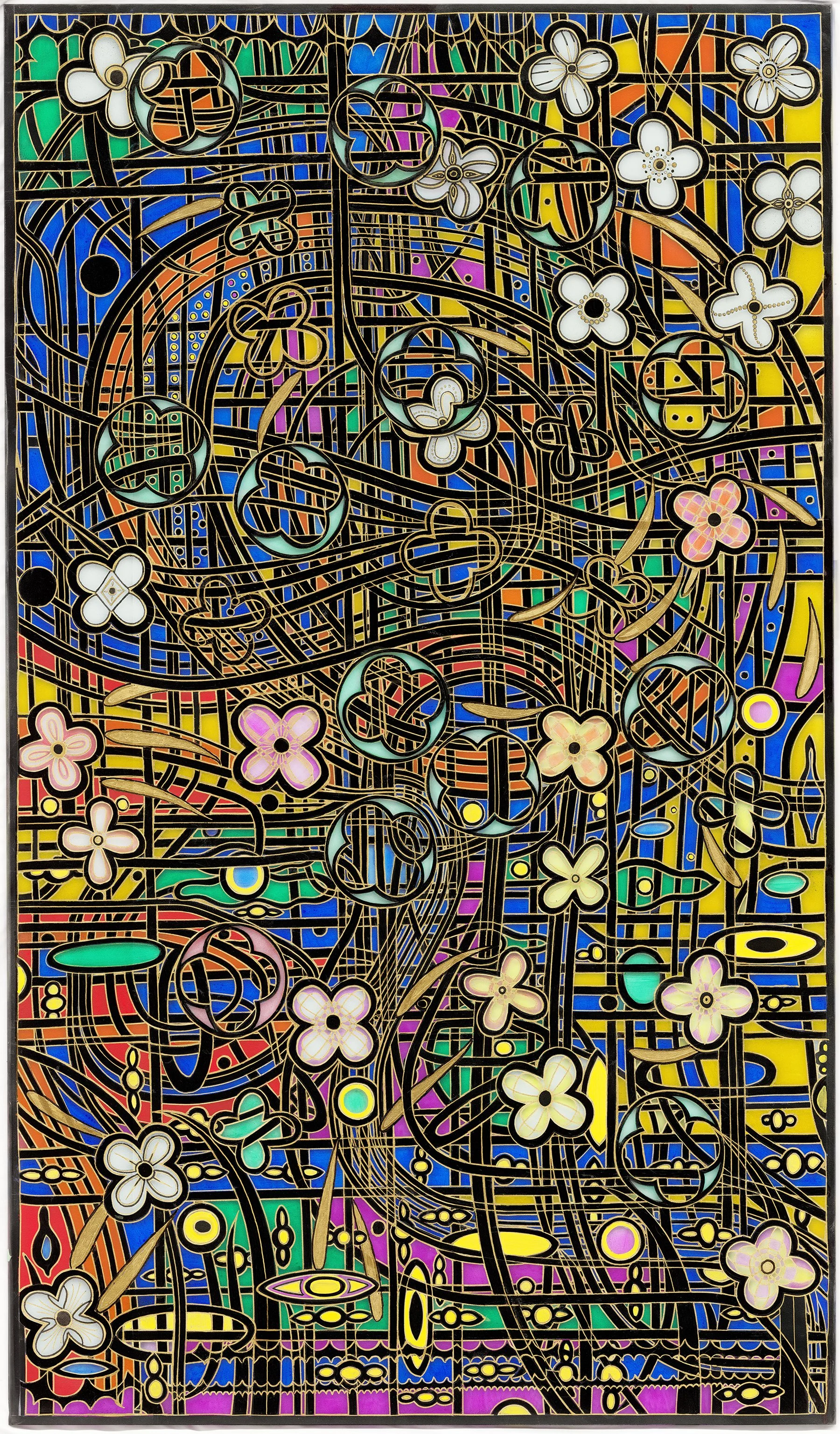 How does the world appear through the multi-faceted eye of a dragonfly, as it skims across waterlilies and flinting fish in the water below?  Inspired by the old pond on the artist’s Santa Fe property, this complex abstract creation takes advantage of the depth and translucent allure of the sandblasted glass panel below.