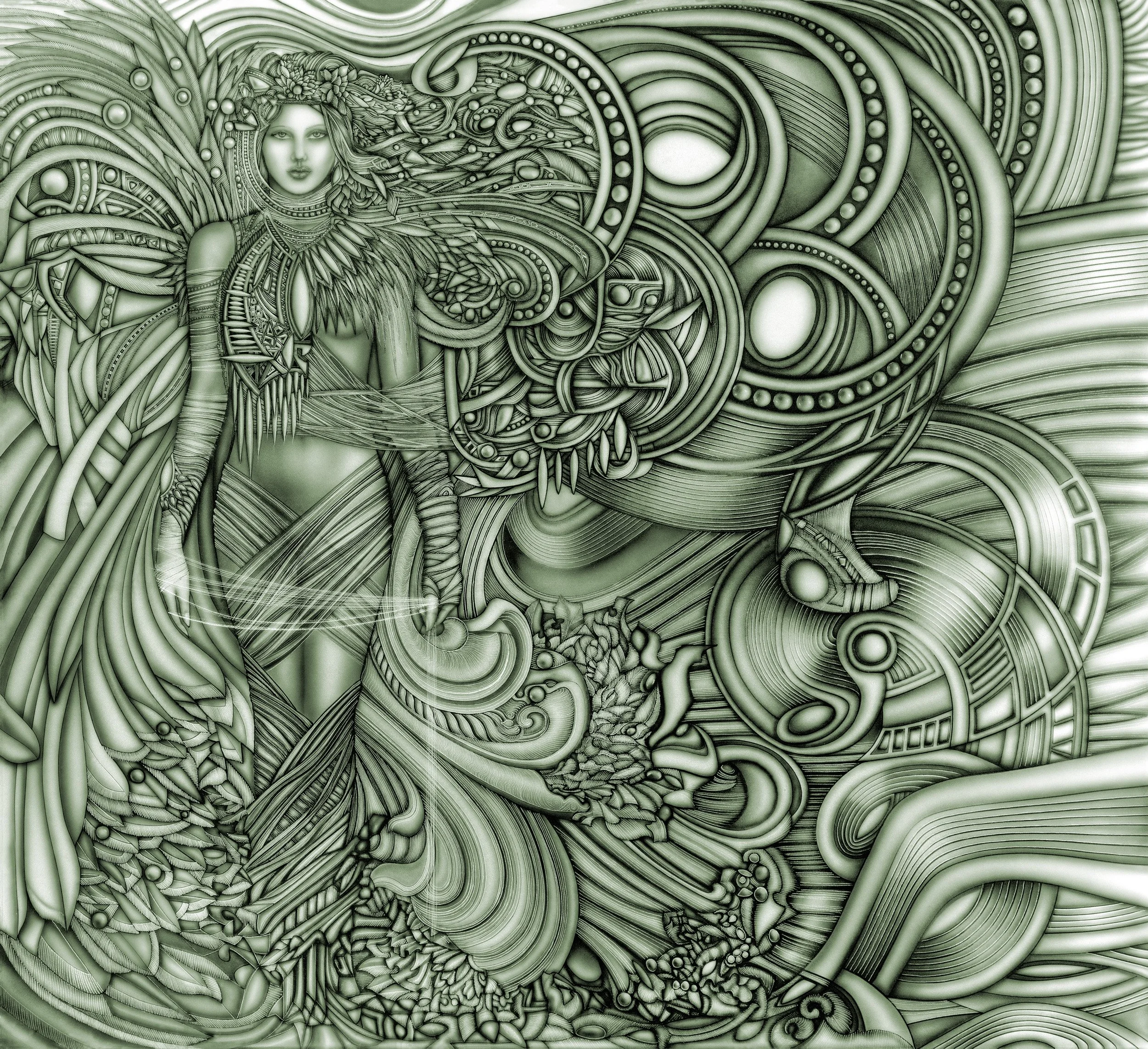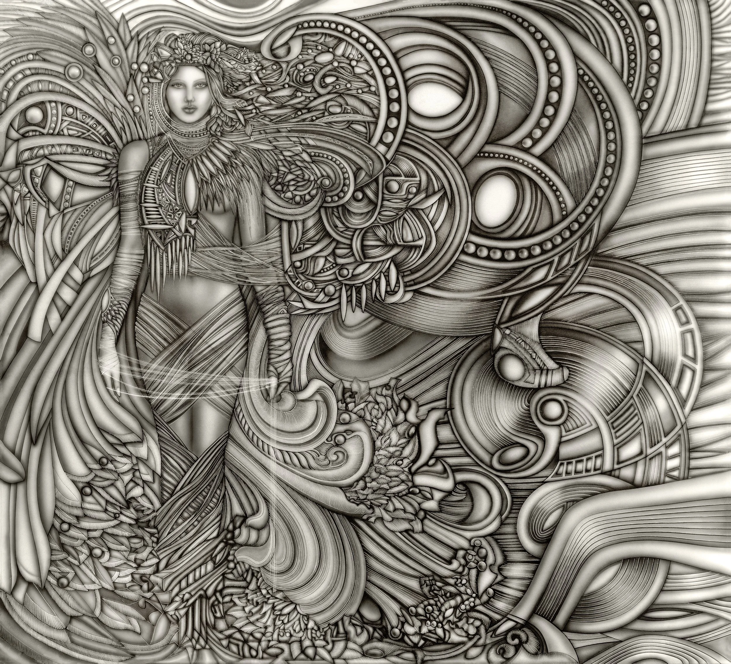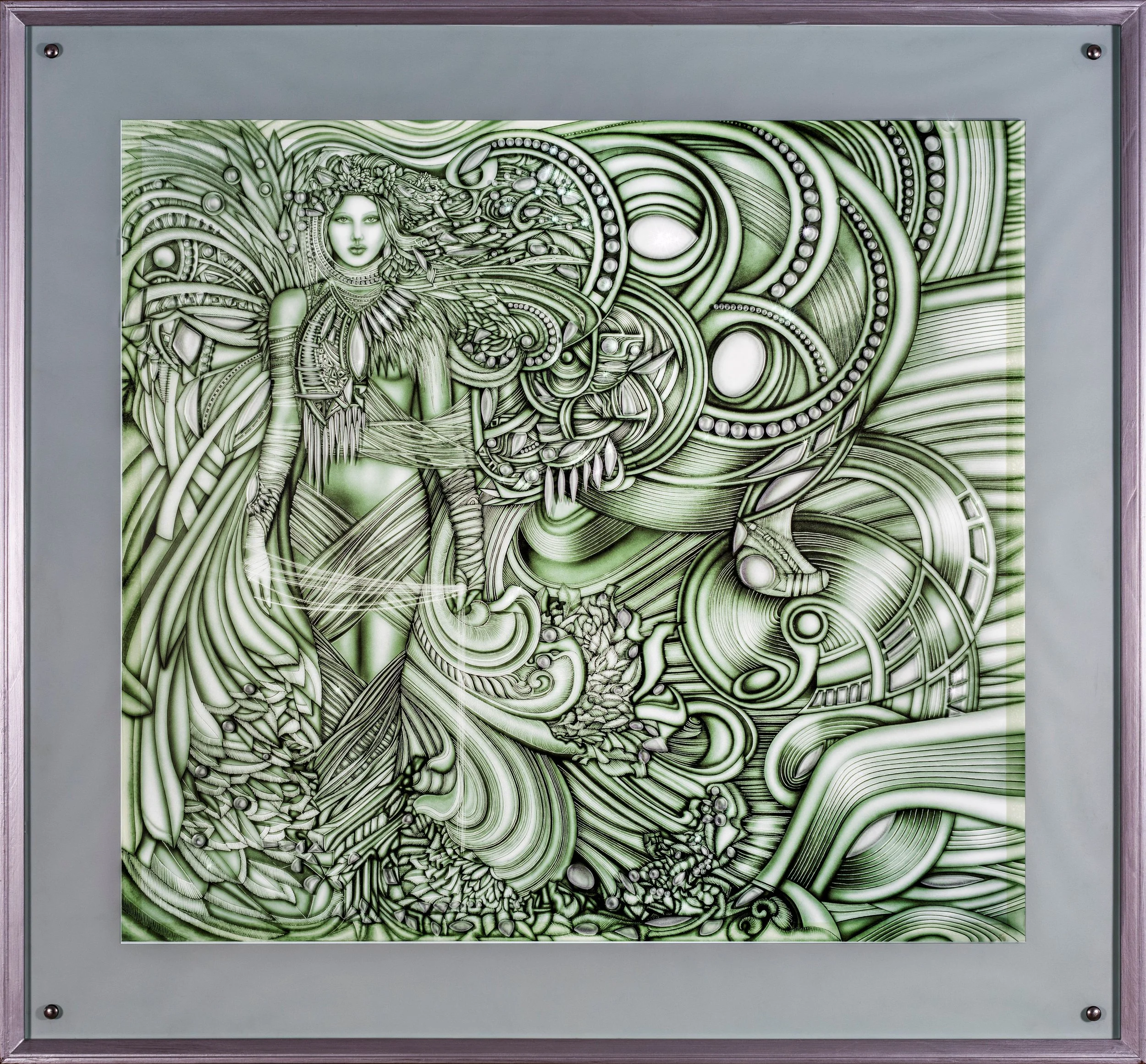 Abandoned by her lover on the shores of a remote Aegean island, Ariadne transforms into a tree, with thread in hand and constellations in her hair, as a storm rages around her. The artist knew nothing of Greek Mythology when she created this stunning work in airbrushed liquid graphite on glass. Her hand and her imagination were guided. Upon completion, the artist stepped back, looked at her creation, unlike anything she had done before, and exclaimed “Who IS this?” She is Ariadne.